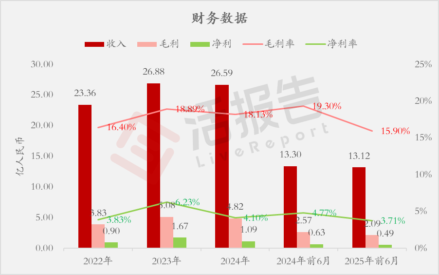 收入分别约为人民币23.36亿、26.88亿、26.59亿、13.30亿、13.12亿,2025年前6月同比-1.34%;