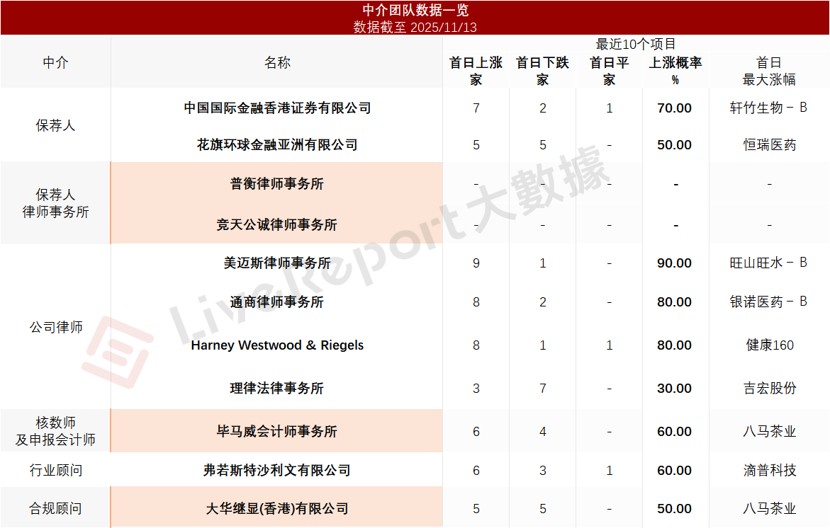 据LiveReport大数据统计,明基医院中介团队共计11家,其中保荐人2家,近10家保荐项目数据表现有待提升;公司律师共计4家,综合项目数据表现普通。整体而言中介团队历史数据表现缺乏亮点。