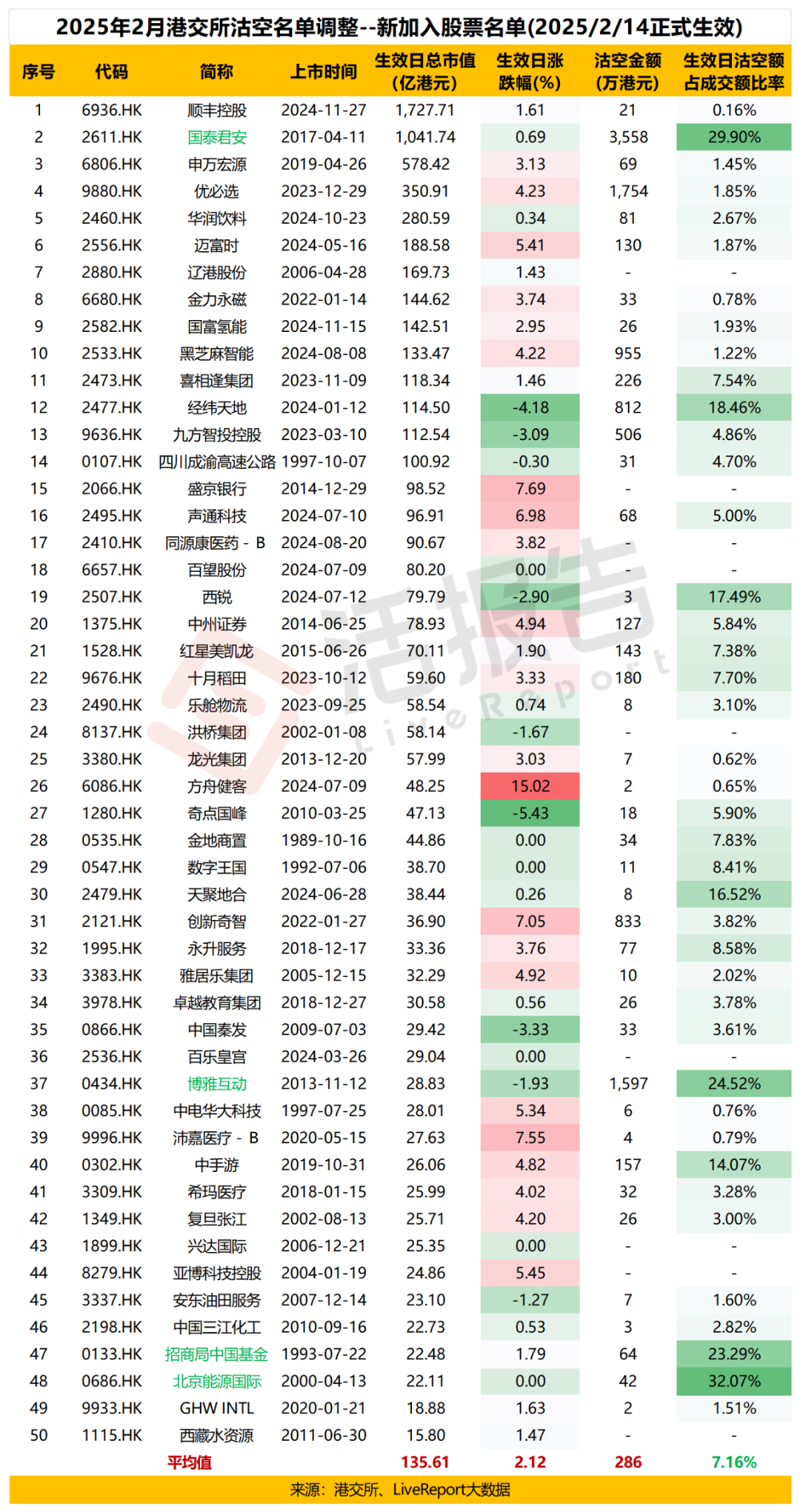 2025年2月14日,港交所定期调整的可沽空名单新纳入50只股票,分别为: