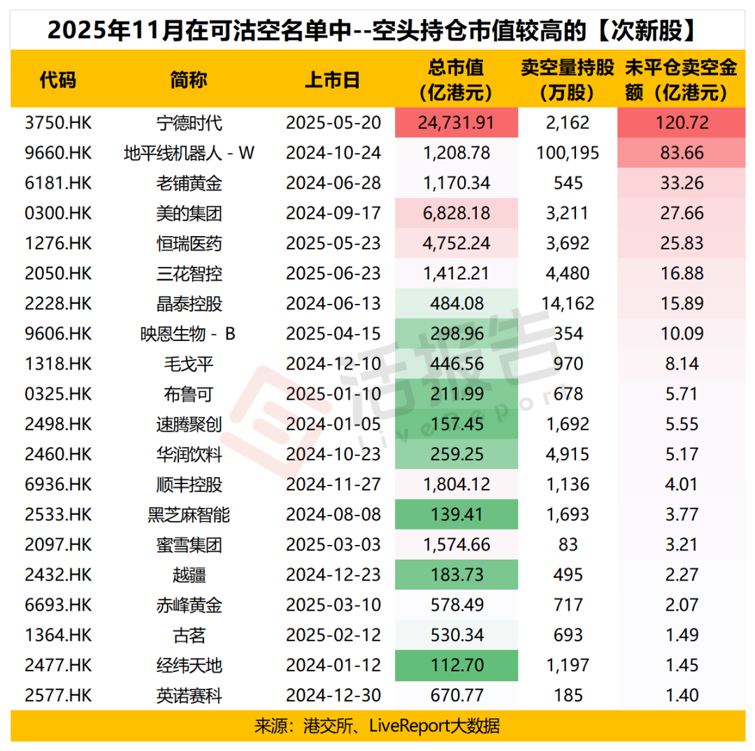 此外,2025年5月20日上市的宁德时代,于上市首日即被纳入可沽空名单。截至11月14日,持有宁德时代空单的持仓市值已累计达120.72亿港元,持有恒瑞医药空单的持仓市值则累计达到25.83亿港元。