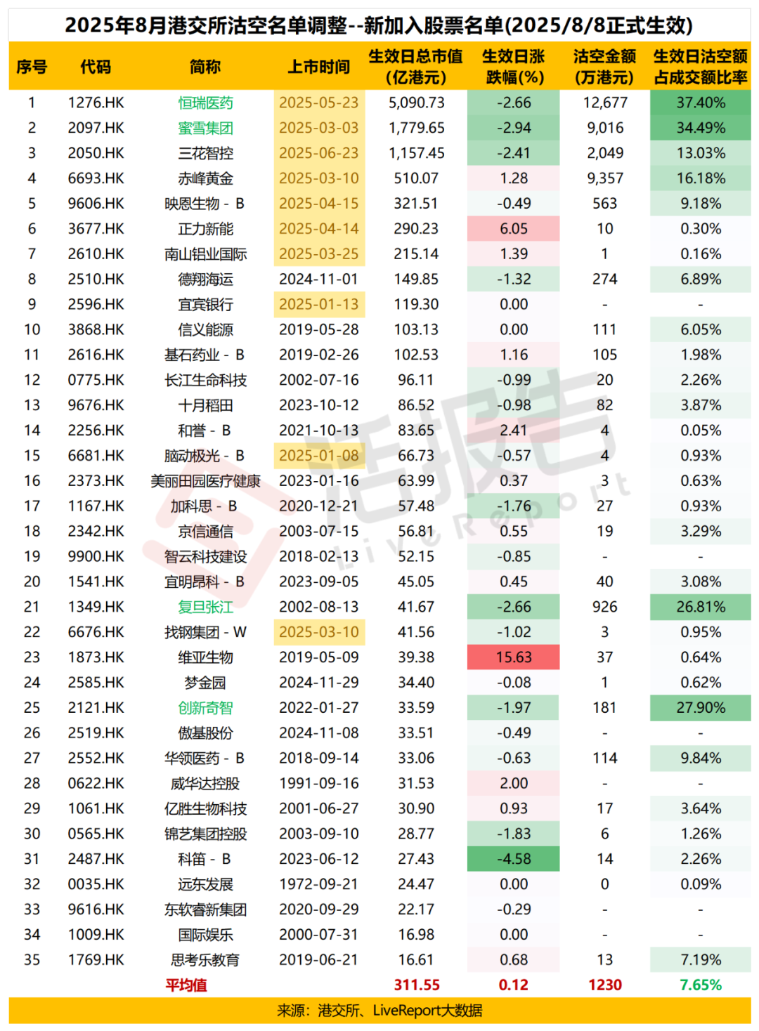 2025年8月8日,港交所定期调整的可沽空名单新纳入35只股票,分别为: