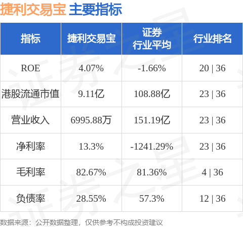 捷利交易宝港股市值9.11亿港元,在证券行业中排名第23。主要指标见下表:
