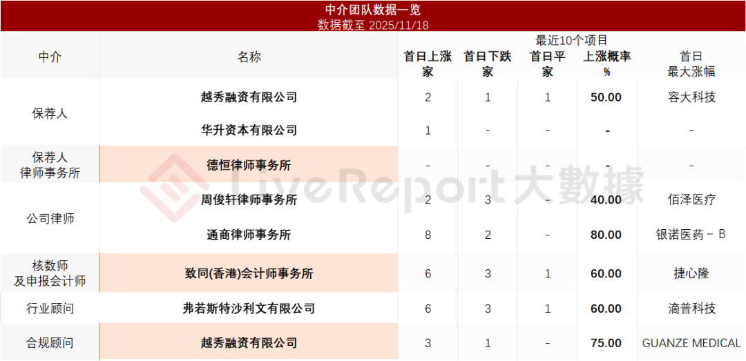 据LiveReport大数据统计,河南联合信息中介团队共计8家,其中保荐人2家,近10家保荐项目数据表现有待提升;公司律师共计2家,综合项目数据表现普通。整体而言中介团队历史数据表现缺乏亮点。