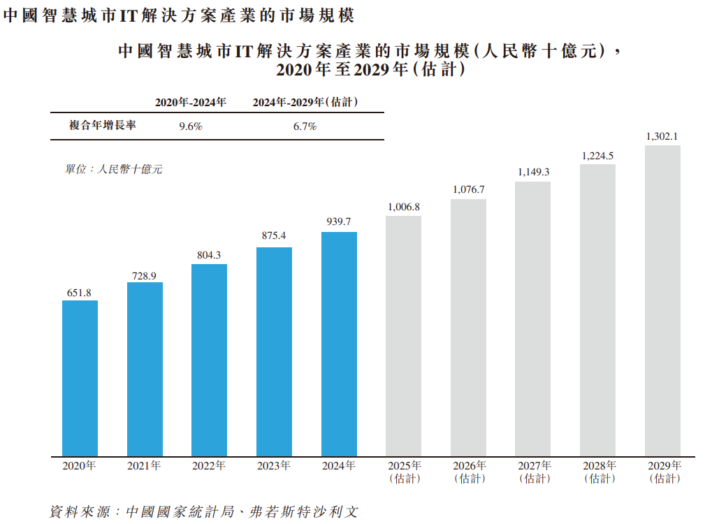 中国智慧城市IT解决方案行业的市场规模从2020年的6,518亿元人民币增长至2024年的9,397亿元人民币,年均复合增长率为9.6%。从2024年到2029年,市场规模预计将以6.7%的年均复合增长率上升,预计2029年市场规模将达到人民币13,021亿元。本公司于中国智慧城市IT解决方案行业所占市场份额不到1%(0.00001%)(按收入计)。
