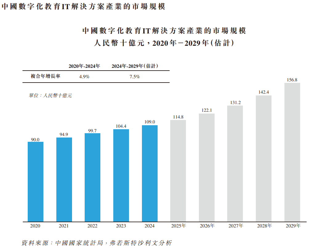 中国数字化教育IT解决方案整体市场规模由2020年的人民币900亿元增长至2024年的人民币1,090亿元,复合年增长率为4.9%。2024年至2029年,市场规模预计年复合增长率为7.5%,预计2029年市场规模将达到人民币1,568亿元。本公司于中国数字化教育IT解决方案行业所占市场份额不到1%(0.005%)(按收入计)。