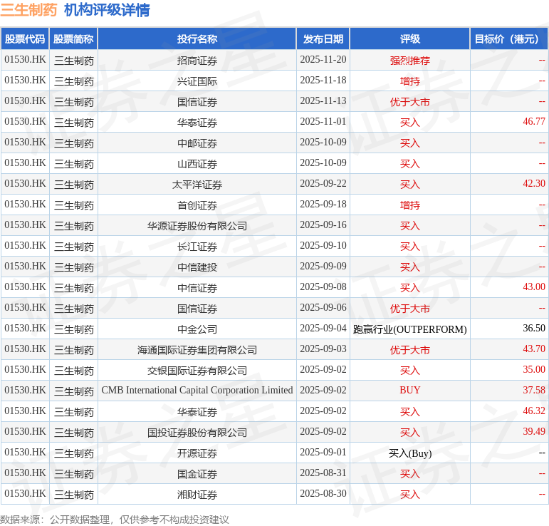 投行对该股的评级以买入为主,近90天内共有13家投行给出买入评级,近90天的目标均价为41.18港元。招商证券最新一份研报给予三生制药强烈推荐评级。