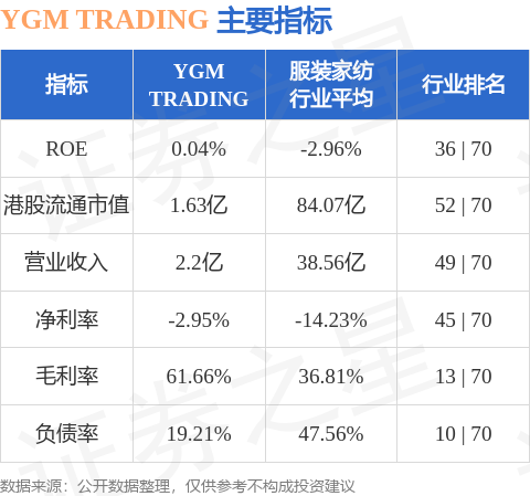 YGM TRADING港股市值1.63亿港元,在服装家纺行业中排名第52。主要指标见下表: