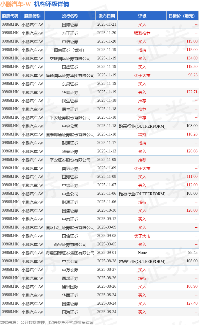 投行对该股的评级以买入为主,近90天内共有18家投行给出买入评级,近90天的目标均价为114.66港元。国海证券最新一份研报给予小鹏汽车-W买入评级。