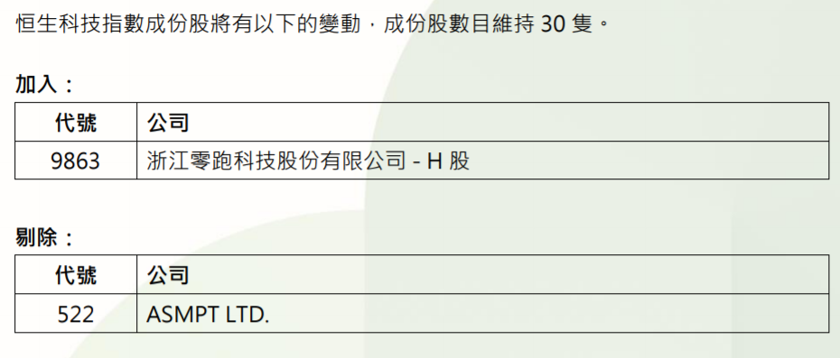 恒生科技指数成份股加入零跑汽车(9863.HK),剔除ASMPT(0522.HK),成份股数目维持30只。