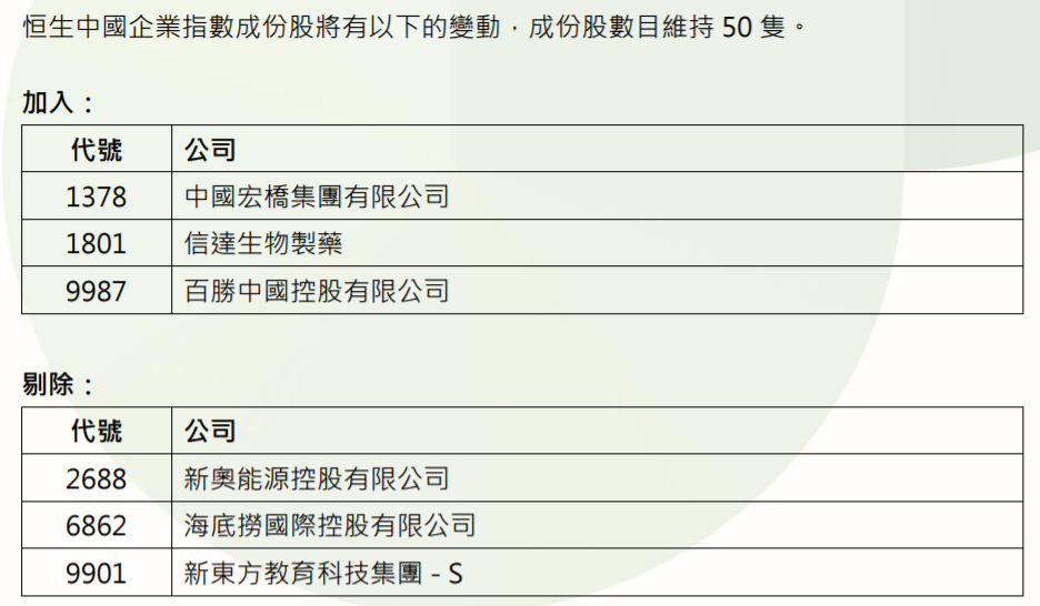 恒生中国企业指数成份股没有变动,成份股数目维持50只,加入中国宏桥(1378.HK)、信达生物(1801.HK)、百胜中国(9987.HK),剔除新奥能源(2688.HK)、海底捞(6862.HK)、新东方-S(9901.HK)。
