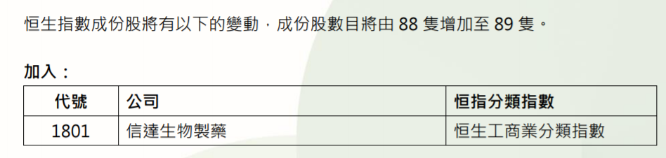 恒生指数成份股将有以下的变动,成份股数目将由88只增加至89只,纳入信达生物(1801.HK)。