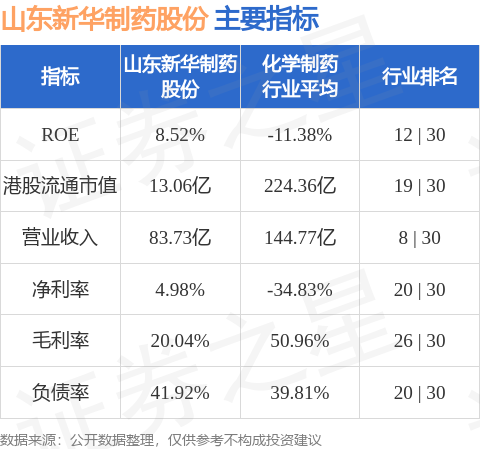 山东新华制药股份港股市值13.06亿港元,在化学制药行业中排名第19。主要指标见下表: