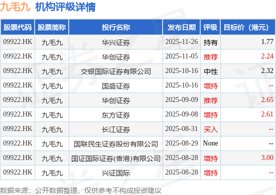 截至2025年11月26日收盘,九毛九(09922.HK)报收于1.81港元,上涨3.43%,成交量750.15万股,成交额1356.17万港元。投行对该股的评级以增持为主,近90天内共有4家投行给出增持评级,近90天的目标均价为2.43港元。华兴证券最新一份研报给予九毛九持有评级,目标价1.77港元。