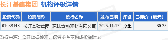 投行对该股的评级以收集为主,近90天内共有1家投行给出收集评级,近90天的目标均价为60.35港元。环球富盛理财有限公司最新一份研报给予长江基建集团收集评级,目标价60.35港元。