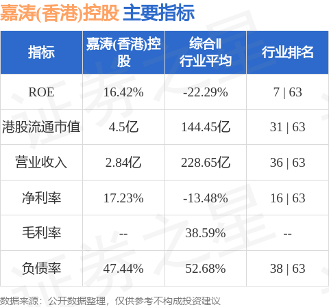 嘉涛(香港)控股港股市值4.5亿港元,在综合Ⅱ行业中排名第31。主要指标见下表: