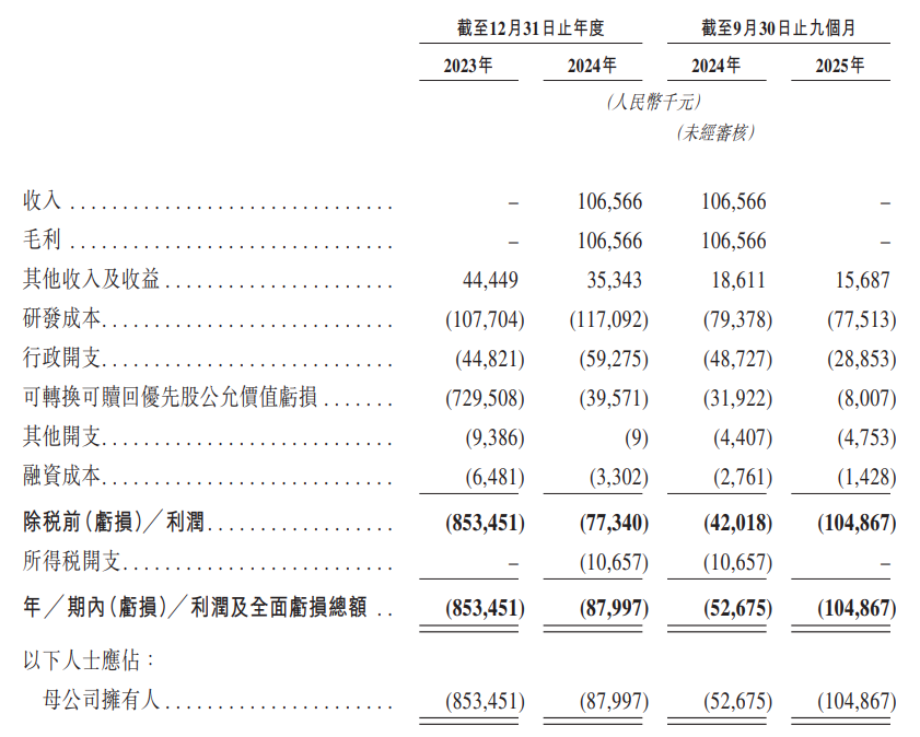 2025年前9个月无收入、毛利,净亏损1.05亿元。