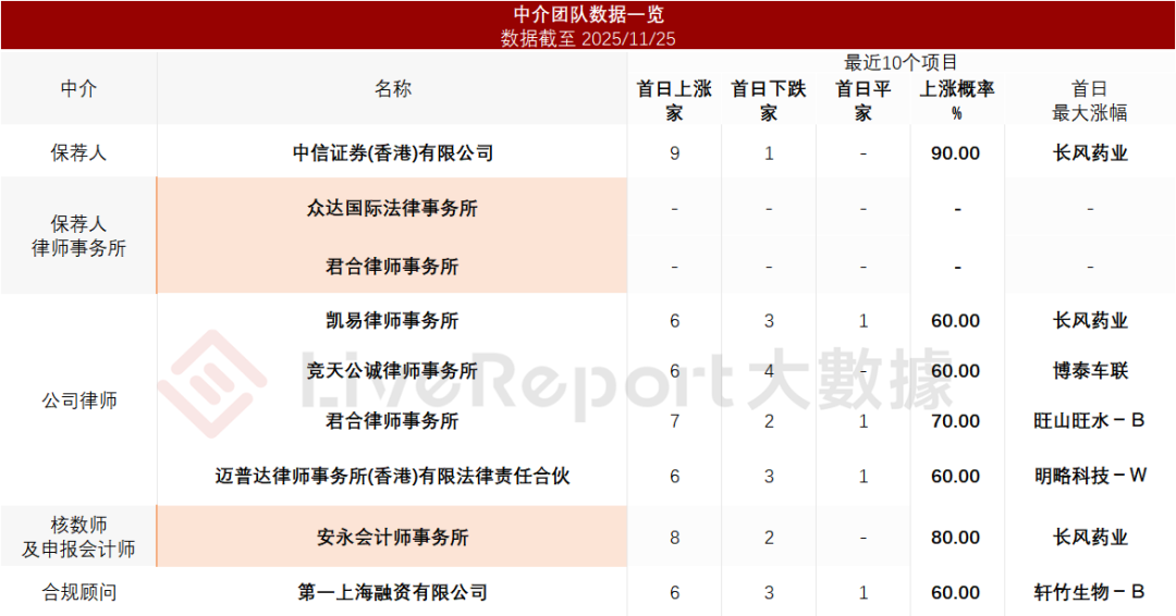 据LiveReport大数据统计,科望医药中介团队共计9家,其中保荐人1家,近10家保荐项目数据表现出色;公司律师共计4家,综合项目数据表现普通。整体而言中介团队历史数据表现中规中矩。