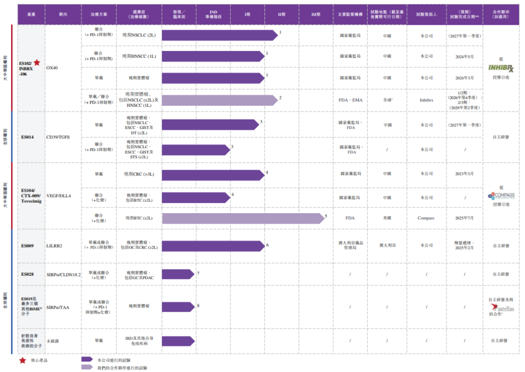 公司的创新管线包括六个主要资产,其中四项处于临床阶段,两项处于临床前阶段。公司的核心产品是ES102,也是临床上先进的六价OX40激活剂抗体,ES102专用于治疗对ICI反应不佳的癌症患者。(ICI:免疫检查点抑制剂,一种免疫疗法)。