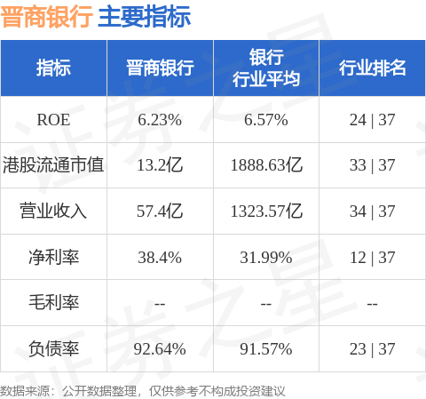 晋商银行港股市值13.2亿港元,在银行行业中排名第33。主要指标见下表: