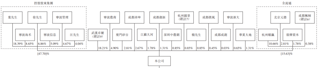 杨乐钧先生持股0.85%;深圳中农网(最终股东包括卓尔智联02098.HK、农产品000061.SZ等)持股0.85%;阿里关联方杭州圆景持股0.85%;宁波浙大持股0.65%;成都微风持股0.45%;成都枫桐持股0.38%;成都成创持股0.03%。