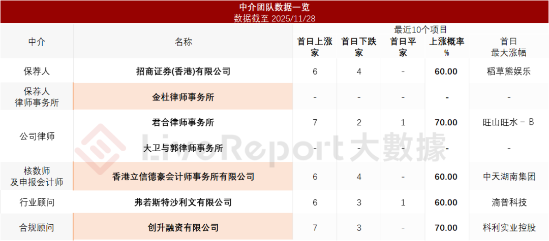 据LiveReport大数据统计,海上鲜介团队共计6家,其中保荐人1家;公司律师共计3家,综合项目数据表现有待提升。整体而言中介团队历史数据表现有待加强。