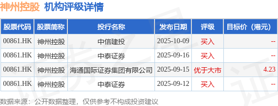 投行对该股的评级以买入为主,近90天内共有3家投行给出买入评级,近90天的目标均价为4.23港元。中信建投最新一份研报给予神州控股买入评级。