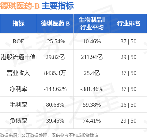 德琪医药-B港股市值29.82亿港元,在生物制品Ⅱ行业中排名第29。主要指标见下表: