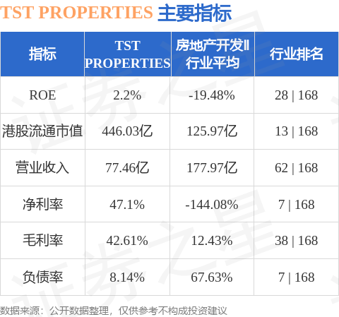TST PROPERTIES港股市值446.03亿港元,在房地产开发Ⅱ行业中排名第13。主要指标见下表: