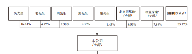 吴甘沙、姜岩、周鑫、彭进展分别持股16.44%、4.77%、2.38%、2.38%;雇员持股平台北京司马驹持股9.53%;此外,吴甘沙先生代表新鼎华麒、嘉兴嘉耀、科源申能持股4.28%;