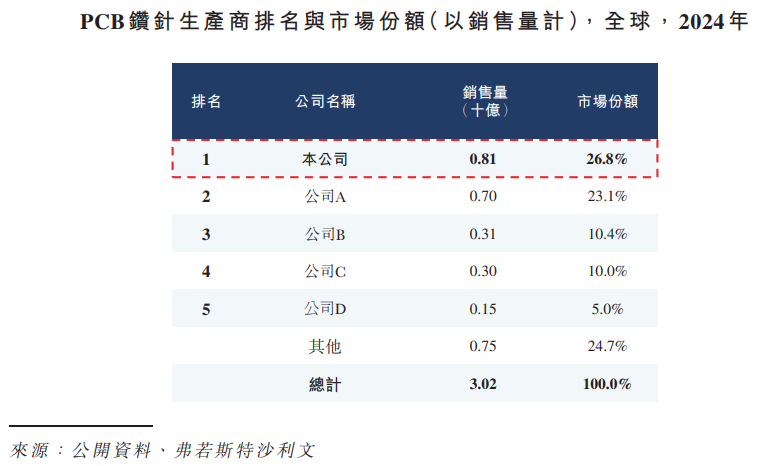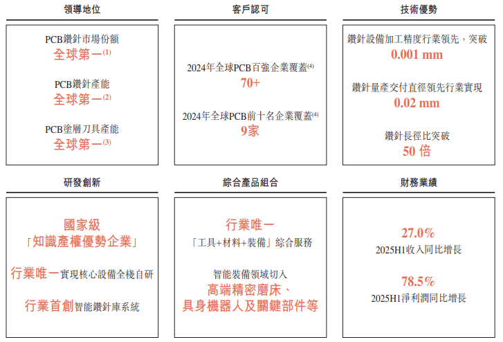 制造领域专用刀具全球龙头。根据弗若斯特沙利文的数据,于往绩记录期间,以销量计,公司为全球最大的钻针供货商。