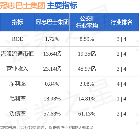 冠忠巴士集团港股市值13.64亿港元,在公交Ⅱ行业中排名第2。主要指标见下表: