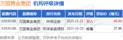 投行对该股的评级以收集为主,近90天内共有1家投行给出收集评级,近90天的目标均价为38.98港元。中信证券最新一份研报给予万国黄金集团买入评级,目标价40港元。