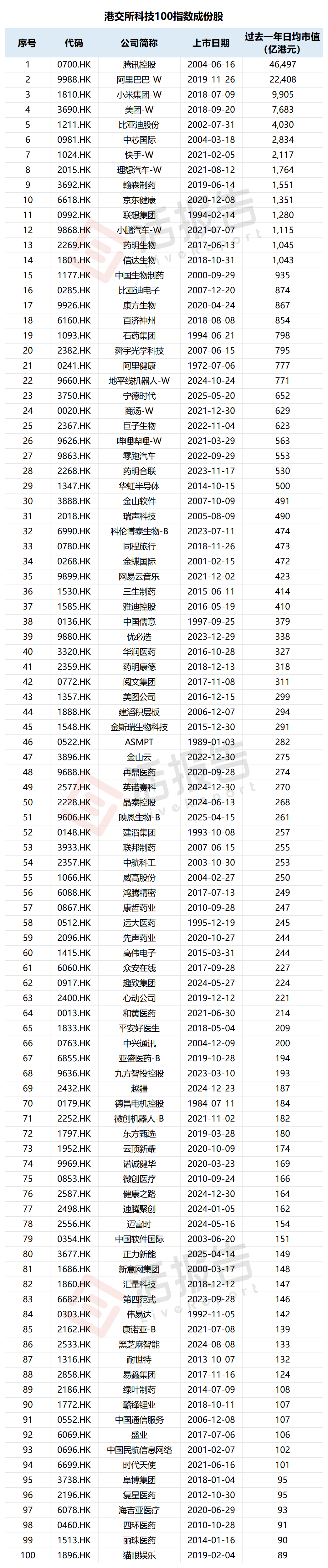 据LiveReport大数据基于最新成份股名单统计数据显示,港交所科技100指数中市值最低的成份股的日均市值约为89亿港元。