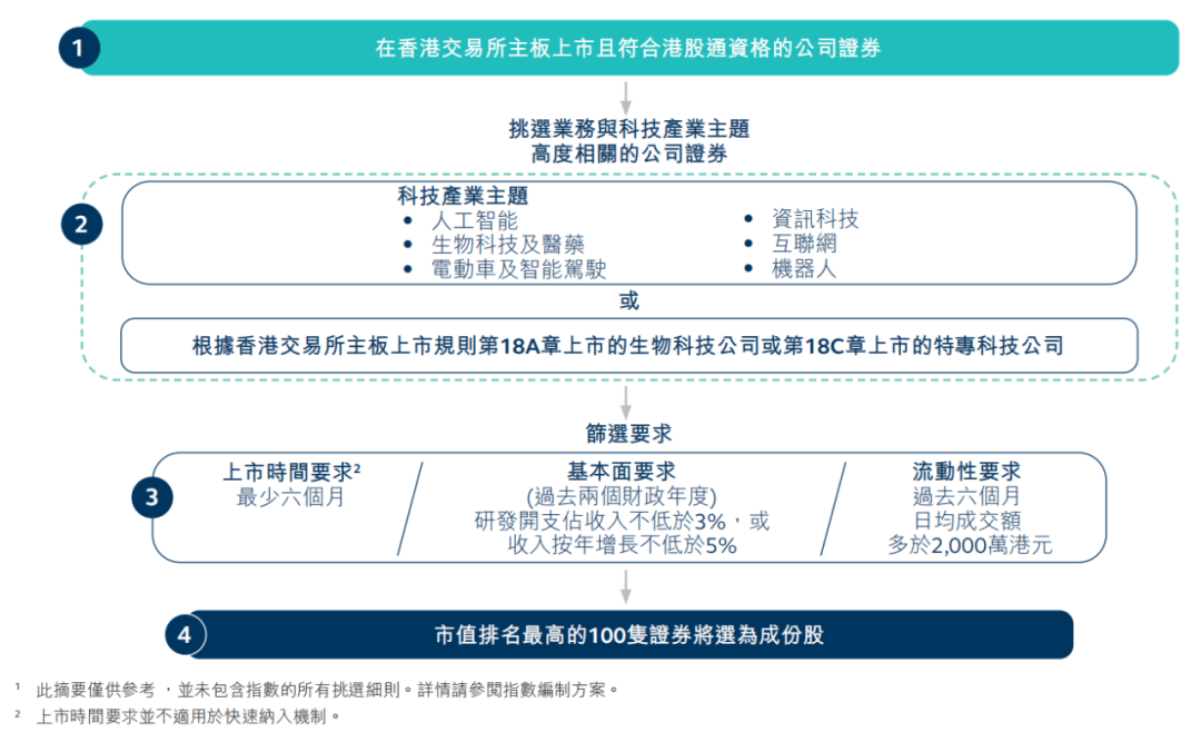 港交所科技100的成份股范围包括在香港交易所主板上市且符合港股通资格的公司证券。不包括根据香港交易所上市规则第二十一章上市之投资公司。