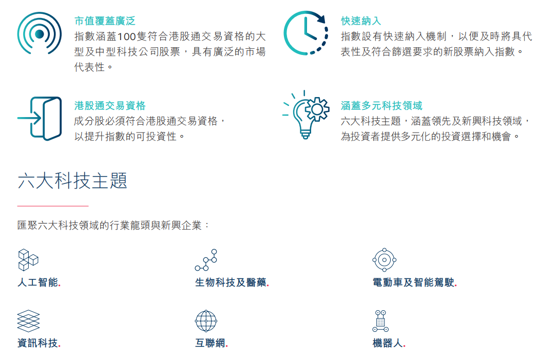 涵盖多元科技领域:指数覆盖六大科技及创新主题,包括人工智能、生物科技及医药、电动车及智能驾驶、信息科技、互联网和机器人,横跨龙头及新兴企业,为投资者提供多元化的投资选择及机会。