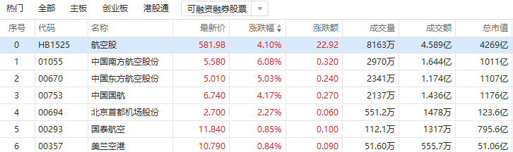 航空股盘中再度走高,截至发稿,中国南方航空股份涨超6%,中国东方航空股份涨超5%,中国国航涨超4%。