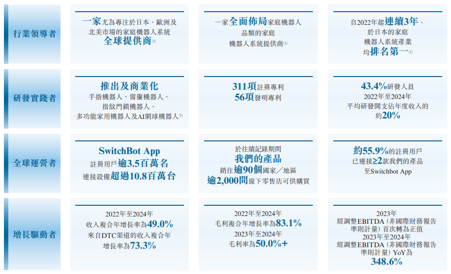 公司产品的品牌名称为SwitchBot及Acemate。公司的用户可以主要通过SwitchBot App随时与产品互动,满足彼等不同家庭生活需求,使公司的产品能够有效实时互动。截至最后实际可行日期,公司的家庭机器人系统产品共有涉及47个SPU的七个产品类别。