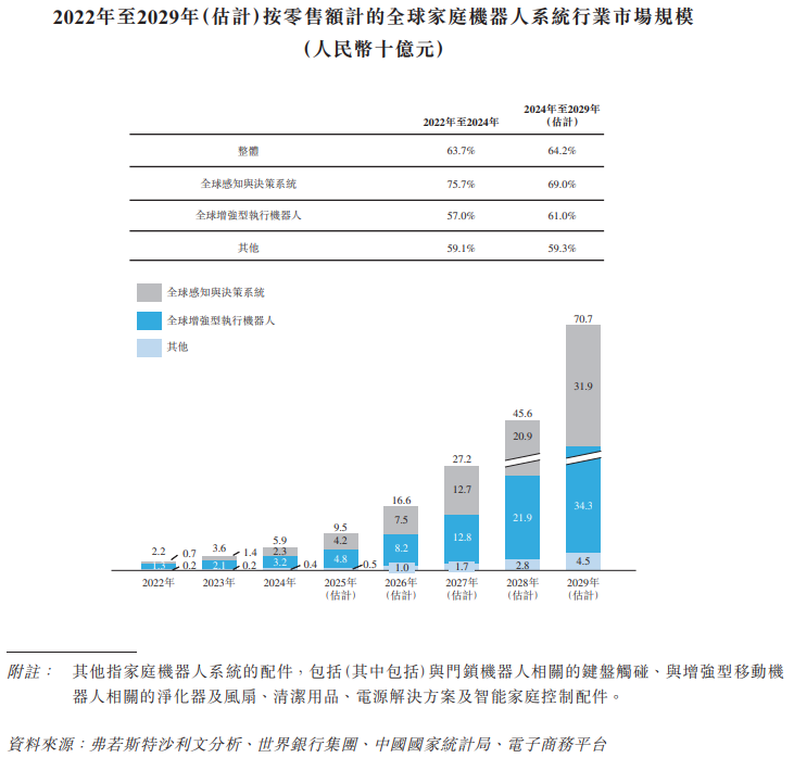 根据弗若斯特沙利文(Frost & Sullivan)的报告,全球家庭机器人系统行业的市场规模从2022年的人民币22亿元增长至2024年的人民币59亿元,期间复合年增长率约为63.7%。预计2029年市场规模将达到人民币707亿元,2024年至2029年的复合年增长率约为64.2%。