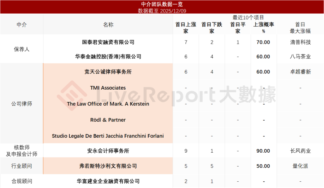 据LiveReport大数据统计,卧安机器人中介团队共计10家,其中保荐人2家,近10家保荐项目数据表现普通;公司律师共计5家,综合项目数据表现有待加强。整体而言中介团队历史数据表现缺乏亮点。