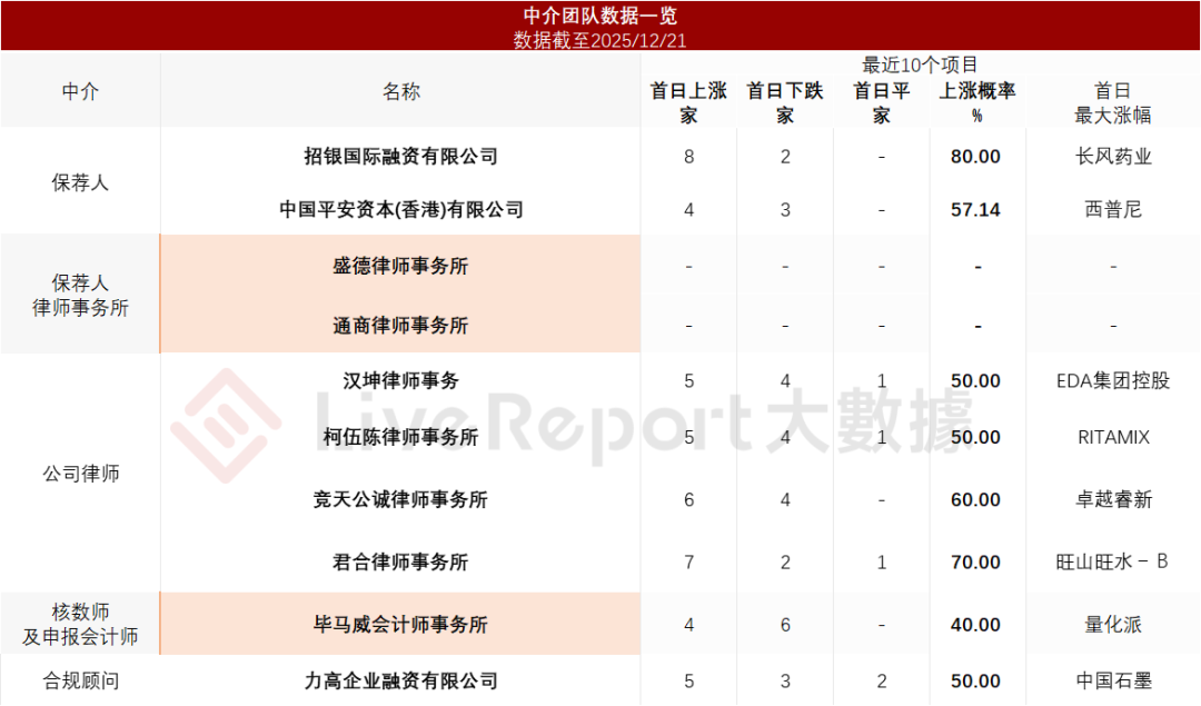 据LiveReport大数据统计,华大北斗中介团队共计10家,其中保荐人2家,近10家保荐项目数据表现普通;公司律师共计4家,综合项目数据表现有待加强。整体而言中介团队历史数据表现有待提升。