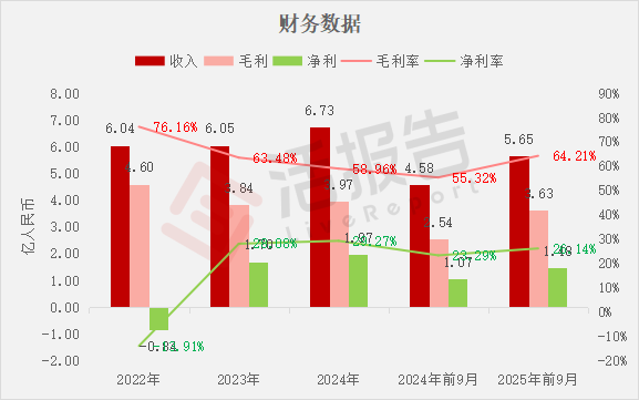 收入分别约为人民币6.04亿、6.05亿、6.73亿、4.58亿、5.65亿,2025年前9月同比+23.22%;