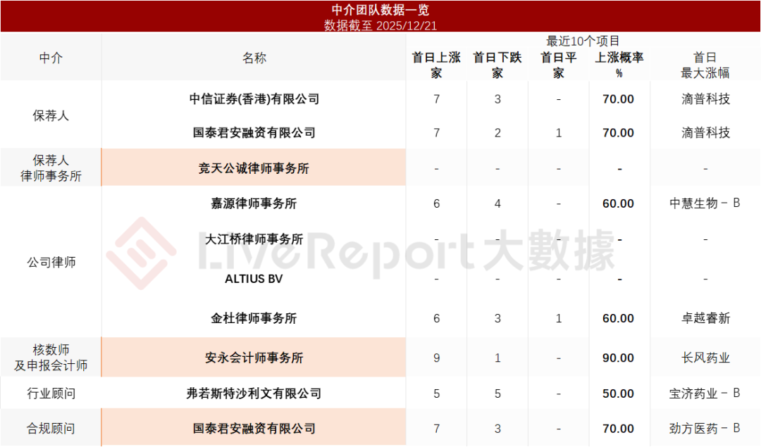 据LiveReport大数据统计,长光辰芯中介团队共计10家,其中保荐人2家,近10家保荐项目数据表现尚可;公司律师共计4家,综合项目数据表现普通。整体而言中介团队历史数据表现中规中矩。