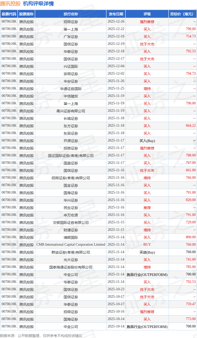 截至2025年12月29日收盘,腾讯控股(00700.HK)报收于596.5港元,下跌1.08%,成交量1850.27万股,成交额111.33亿港元。投行对该股的评级以买入为主,近90天内共有24家投行给出买入评级,近90天的目标均价为761.26港元。招商证券最新一份研报给予腾讯控股强烈推荐评级。