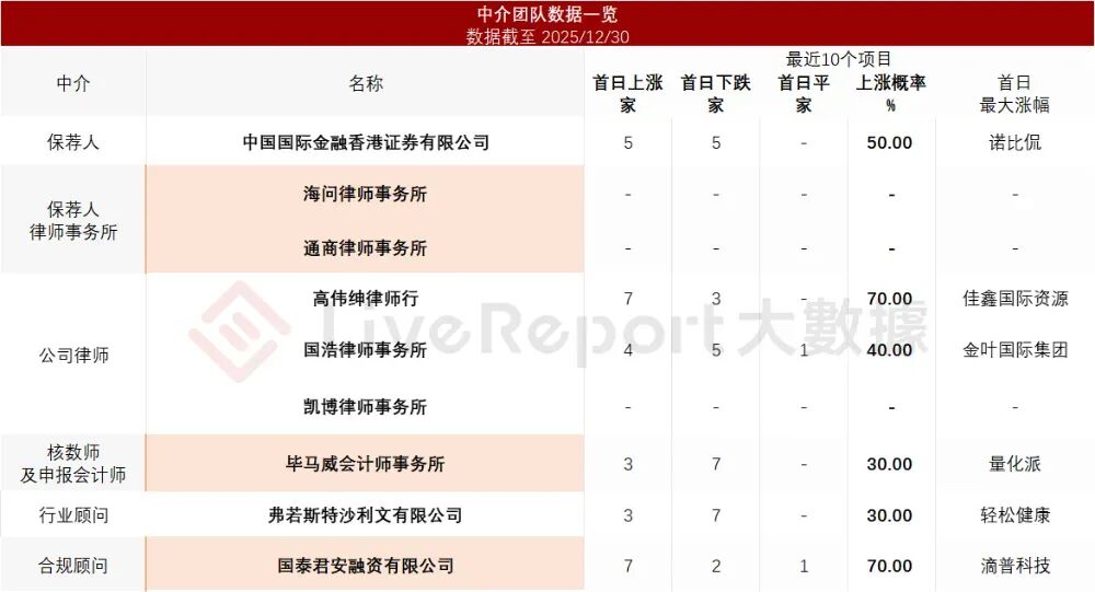 据LiveReport大数据统计,乐欣户外中介团队共计9家,其中保荐人1家,近10家保荐项目数据表现不理想;公司律师共计3家,综合项目数据表现有待加强。整体而言中介团队历史数据表现差强人意。