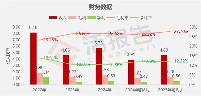 毛利率27.70%。2025年前8月收入、毛利和净利均录得增长。