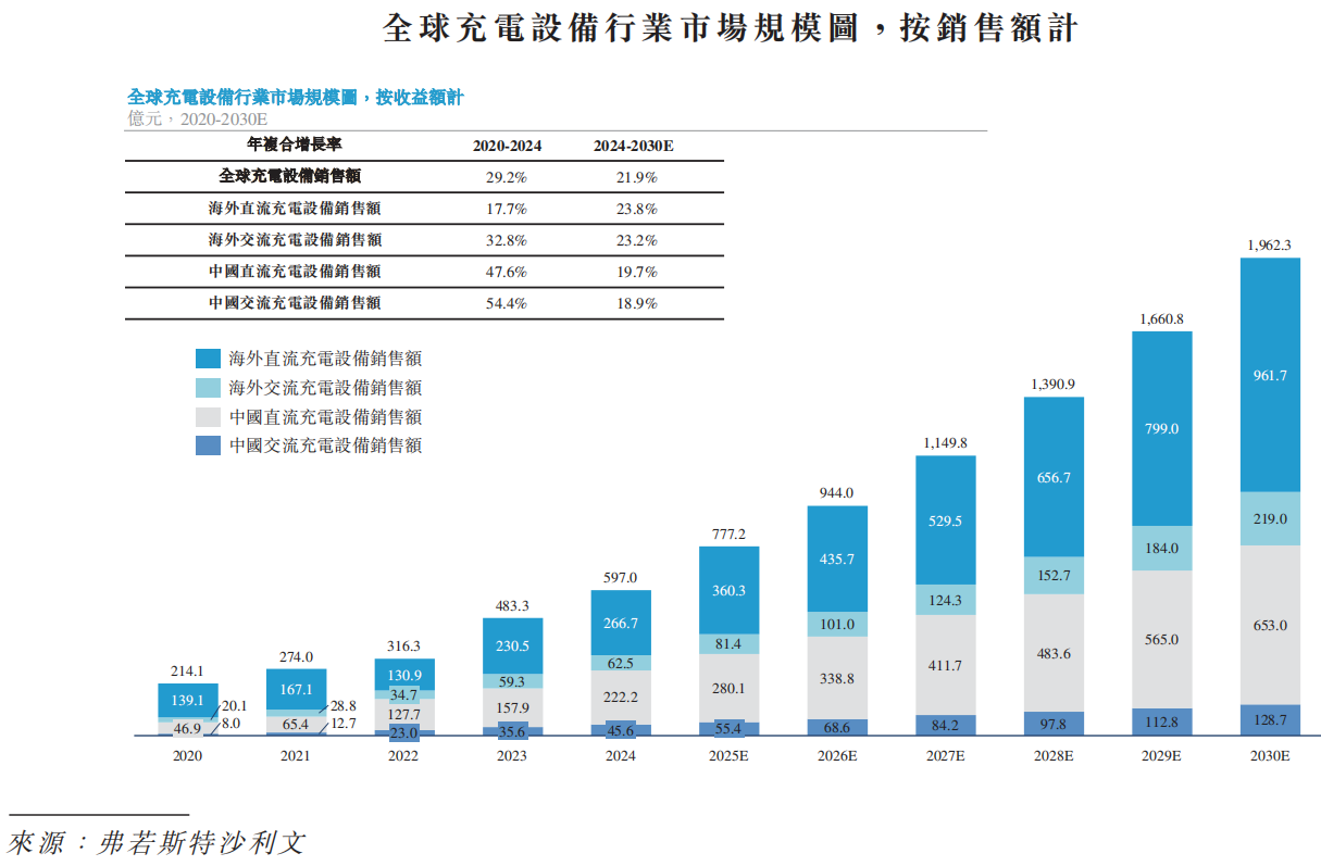 的报告,全球充电设备市场规模从2020年的人民币214.1亿元增长至2024年的人民币597.0亿元,年复合增长率为29.2%。预计2024年至2030年,全球市场规模预计将突破1,962.3亿元人民币(年复合增长率为21.9%)。