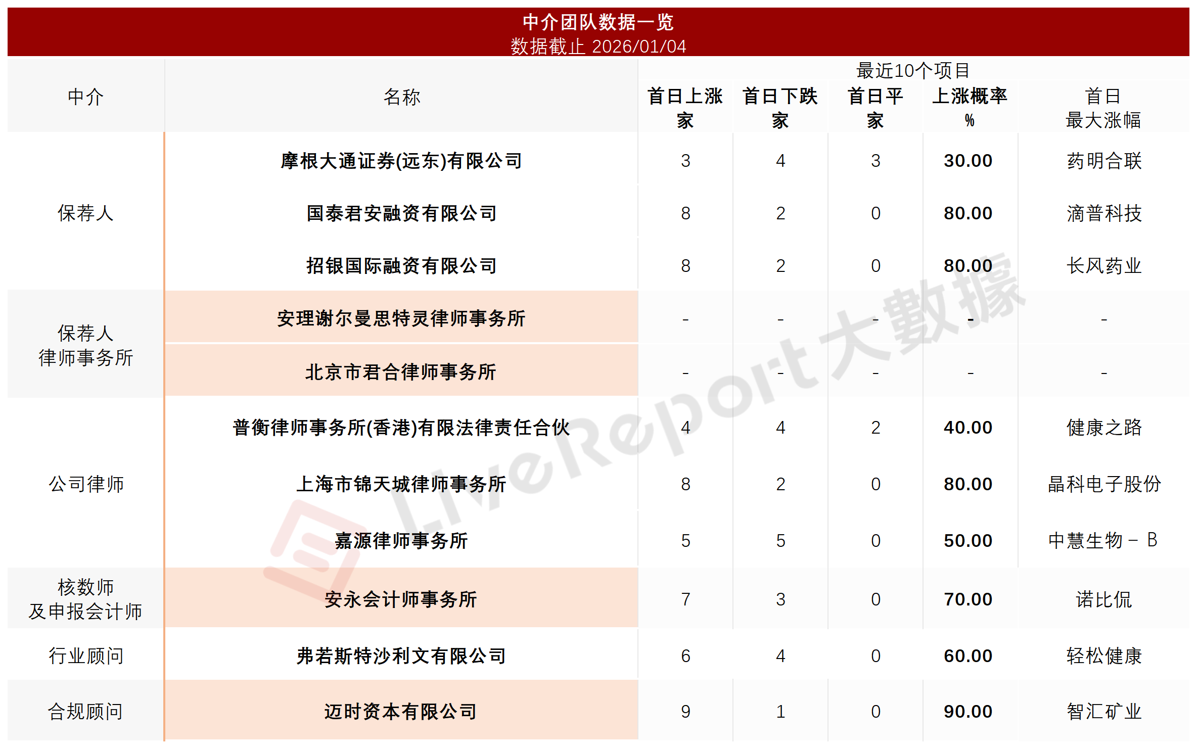 据LiveReport大数据统计,万帮数字中介团队共计11家,其中保荐人3家,近10家保荐项目数据表现不一;公司律师共计3家,综合项目数据表现平平。整体而言中介团队历史数据表现一般。