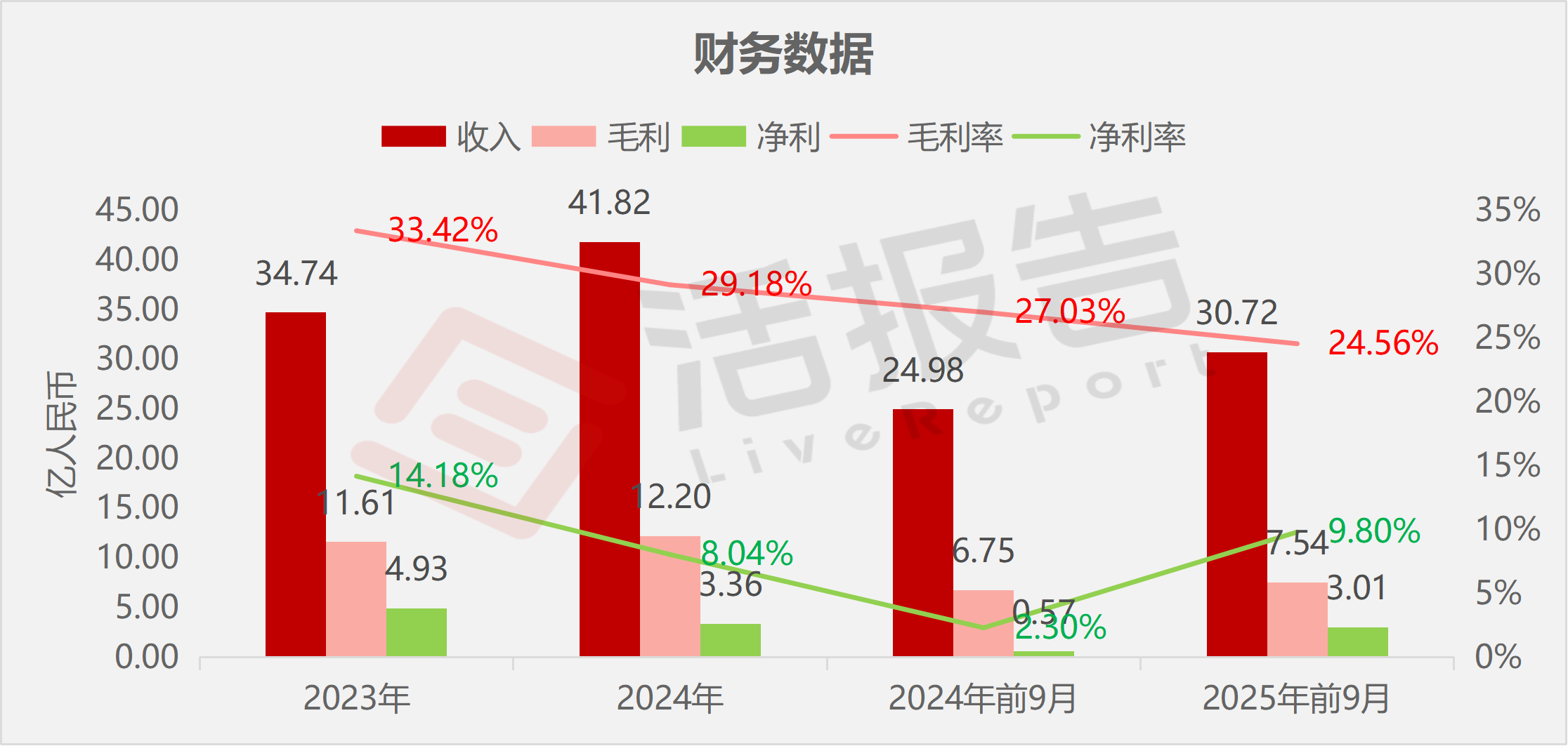收入分别约为人民币34.74亿、41.82亿、24.98亿、30.72亿,2025年前9月同比+22.99%;