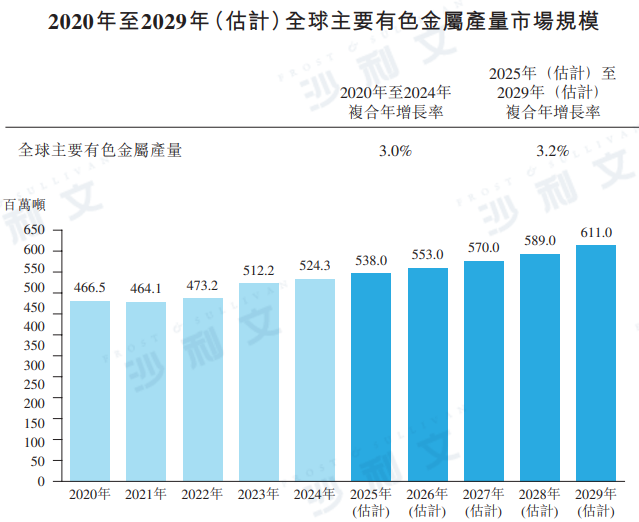 近年来,由于基础设施投资日益增加及可再生能源技术对主要金属的需求日益增长,全球主要有色金属产量呈稳步上升趋势,从2020年的466.5百万吨增至2024年的524.3百万吨,复合年增长率约为3.0%。在城市化进程加快、清洁能源转型以及电动汽车和储能系统对铜、铝和锂等材料的需求日益增长的影响下,该增长得到进一步推动。未来预计到2029年,全球主要有色金属产量将达至611.0百万吨,自2025年起的复合年增长率为3.2%。