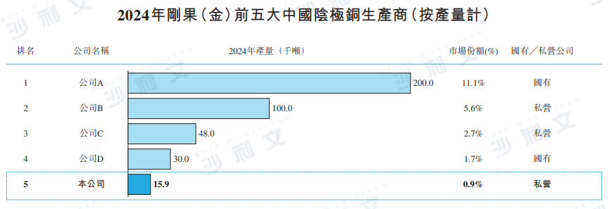 2024年,刚果(金)阴极铜年产量约为180万吨,前五大中国生产商合计占比超过20%。在刚果(金),本公司产量为1.59万吨,位列行业第五。按产量计,于刚果(金)阴极铜行业中,本公司在中国私营生产商中排名第三。